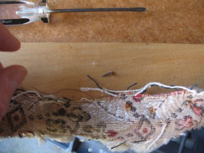 ![]() | Okay, now I know why there were upholstery nails. I tried a staple gun and the staples wouldn't go into the wood... so upholstery nails it is! | |